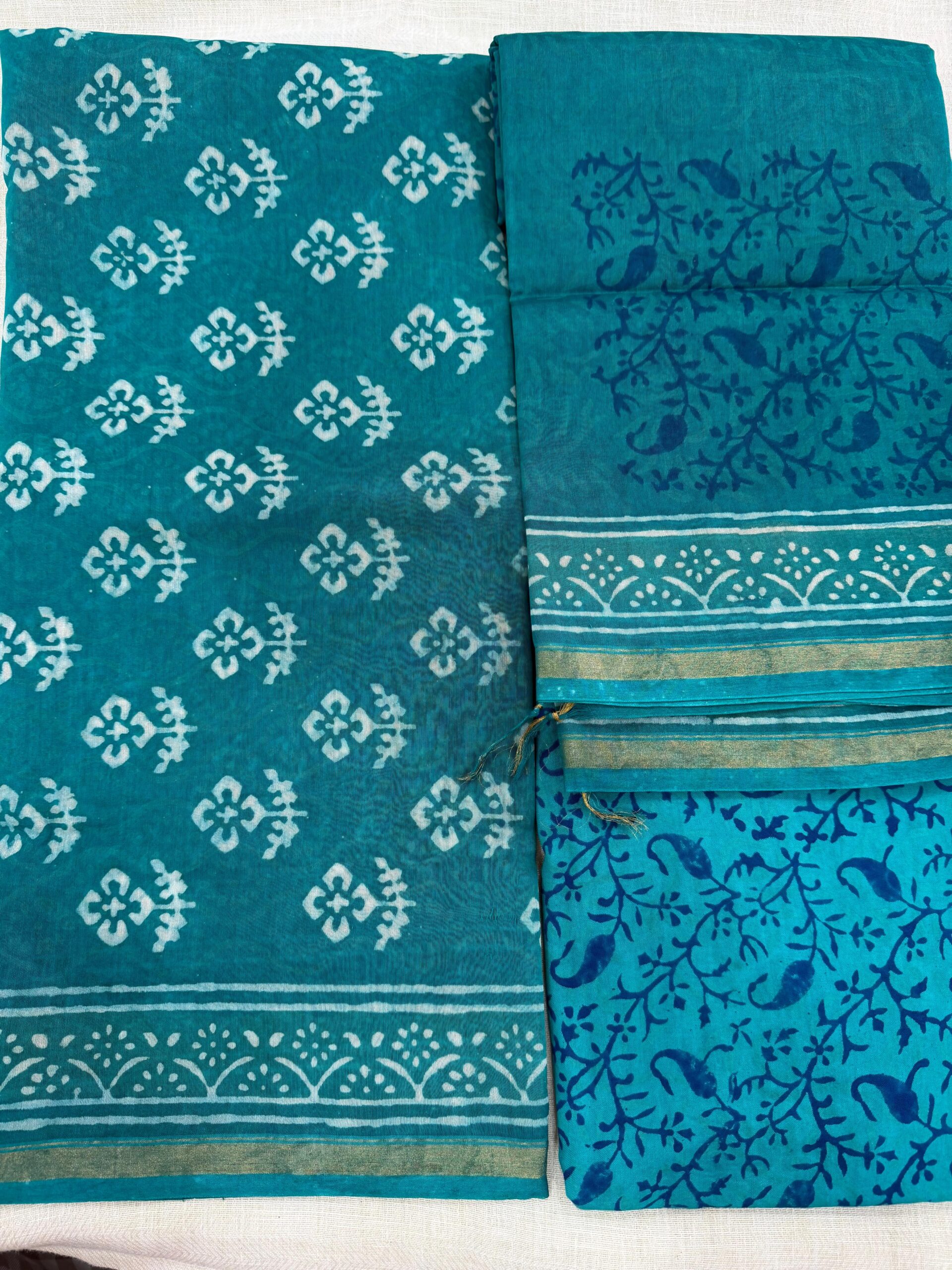 This pure Chanderi silk unstitched suit fabric features a refined teal blue shade blending deep turquoise and sea green for a timeless ethnic look. Designed with subtle traditional motifs and a floral printed dupatta, it offers understated elegance suitable for festive, office, and casual occasions.
